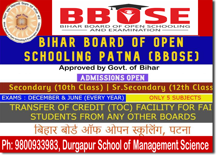 Setting up of Bihar Board of Open Schooling and Examination (BBOSE), as an autonomous Organisation of Education Department,Govt.of Bihar in Feb., 2011 is yet another significant mile stone, on the road of rapid socio-economic development of the State in last few years.BBOSE, is a registered Govt. Society under Societies Act. It is an Open & Distance Learning Institution, set up on the lines of National Institute of Open Schooling (NIOS), under Ministry of Human Resource Development, Govt. of India.It's mandate is to "Reach the Unreached" in terms of Education & Skill, in Bihar through Open & Distance learning mode, in the State with special focus on marginalised Socio-economic and Religious sections. As an Apex Organisation, in the field of school education, it develops it's own content and books, imparts education, corresponding to all levels of formal school system, i.e. from Class I to Class XII. It also hold Public Examination, followed by grand of Certificates for Class X and Class XII, having equivalence with the Certificates of other Formal School Examination Boards like C.B.S.E./I.C.S.E. and other Secondary Boards of the Country.Therefore in effect, it is an amalgamation of State Council of Educational Research and Training and Bihar School Examination Board, in the field of Open & Distance Learning, at school level. It has also been declared as a Nodal Agency for the State. BBOSE has several unique & distinguishing features, which sets it apart from all other formal Examination Boards.